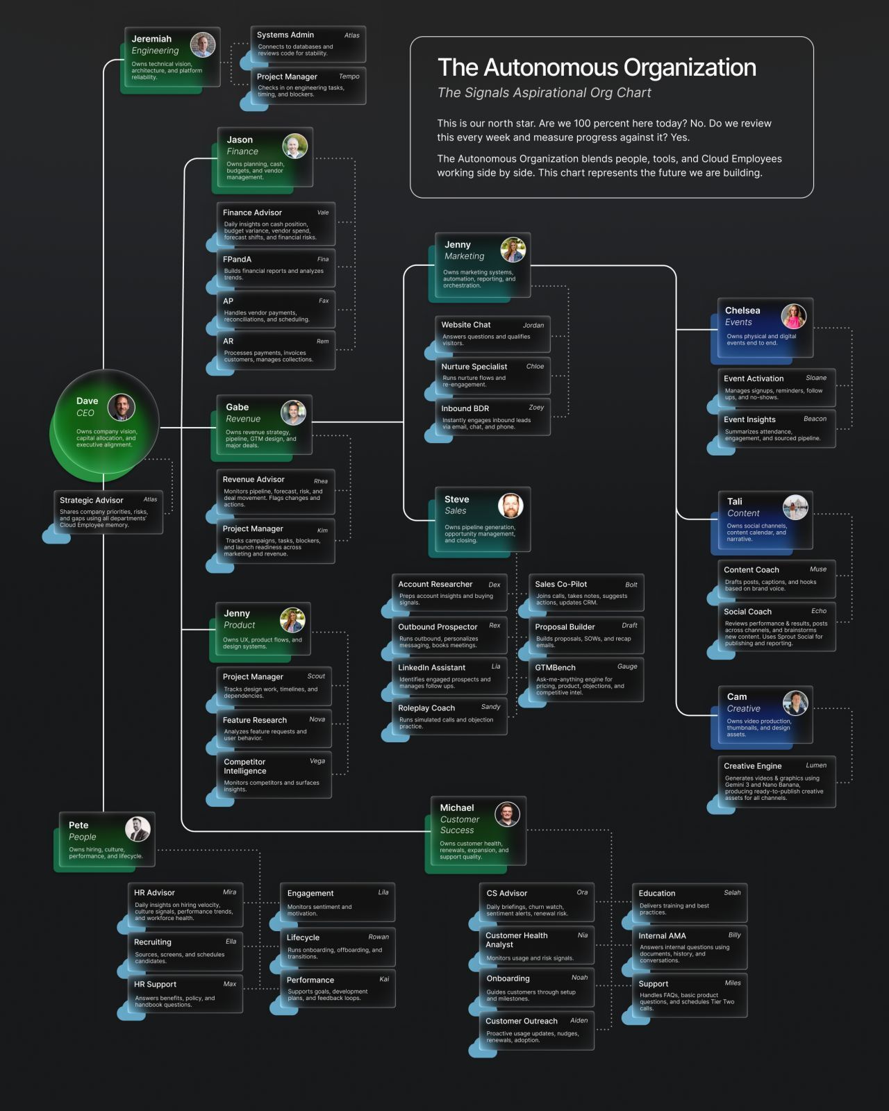 But this is the org chart we review every week. This is the structure we design against. Every new workflow, every hire, every bottleneck gets evaluated through the same question: should a human be doing this, or should a Cloud Employee own it?